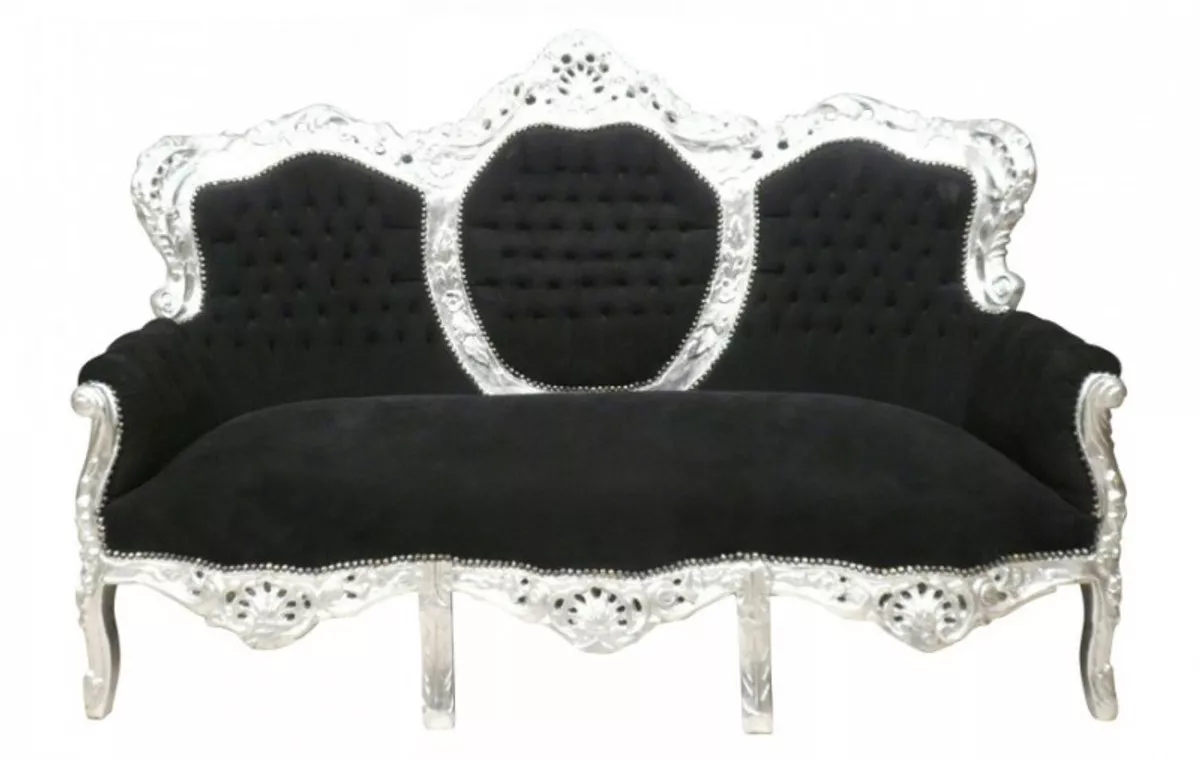 Dieses elegant-klassische 3er Barockssofa mit silbernem Rahmen und hochwertigem Polster aus schwarzem Samtstoff wurde in echter Handarbeit aus massivem Buchenholz gefertigt und ist damit sehr stabil und schwer. Ob als Sitzgruppe in Komination mit den passenden Barocksesseln und Sthlen oder alleinstehend, verleiht er jedem Ambiente einen luxurisen Stil. Das Sofa ist auch in anderen Farben erhltlich.