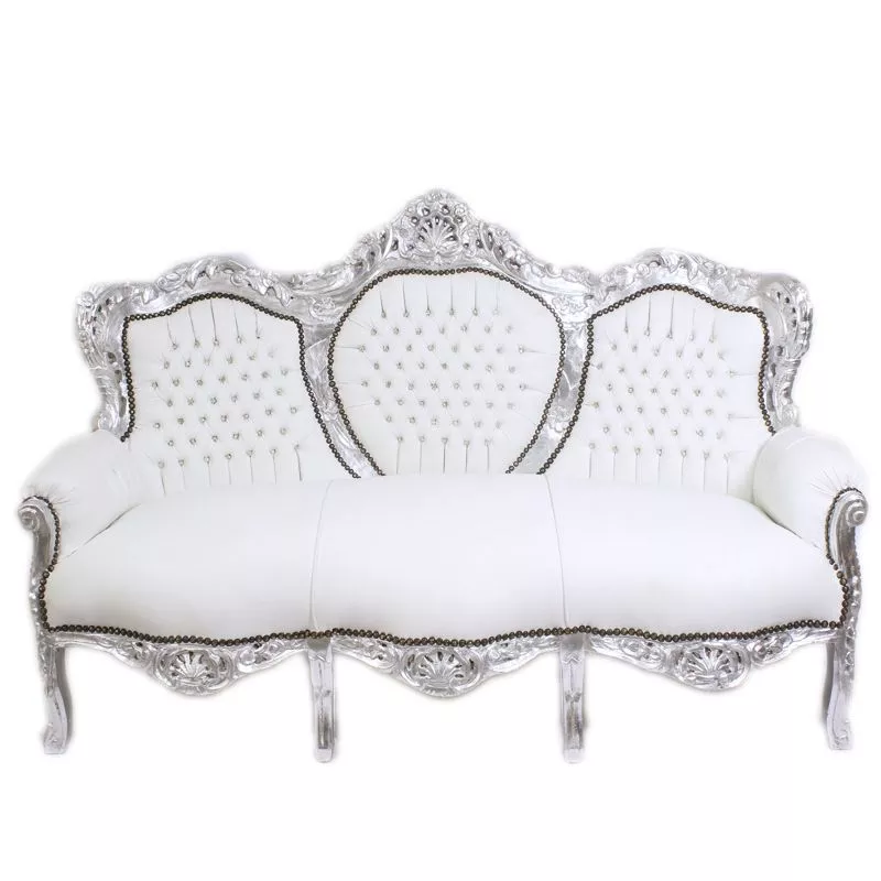 Dieses elegant-klassische 3er Barockssofa mit silbernem Rahmen und hochwertigem Polster aus weissen Kunstleder wurde in echter Handarbeit aus massivem Buchenholz gefertigt und ist damit sehr stabil und schwer. Ob als Sitzgruppe in Komination mit den passenden Barocksesseln und Sthlen oder alleinstehend, verleiht er jedem Ambiente einen luxurisen Stil. Das Sofa ist auch in anderen Farben erhltlich.