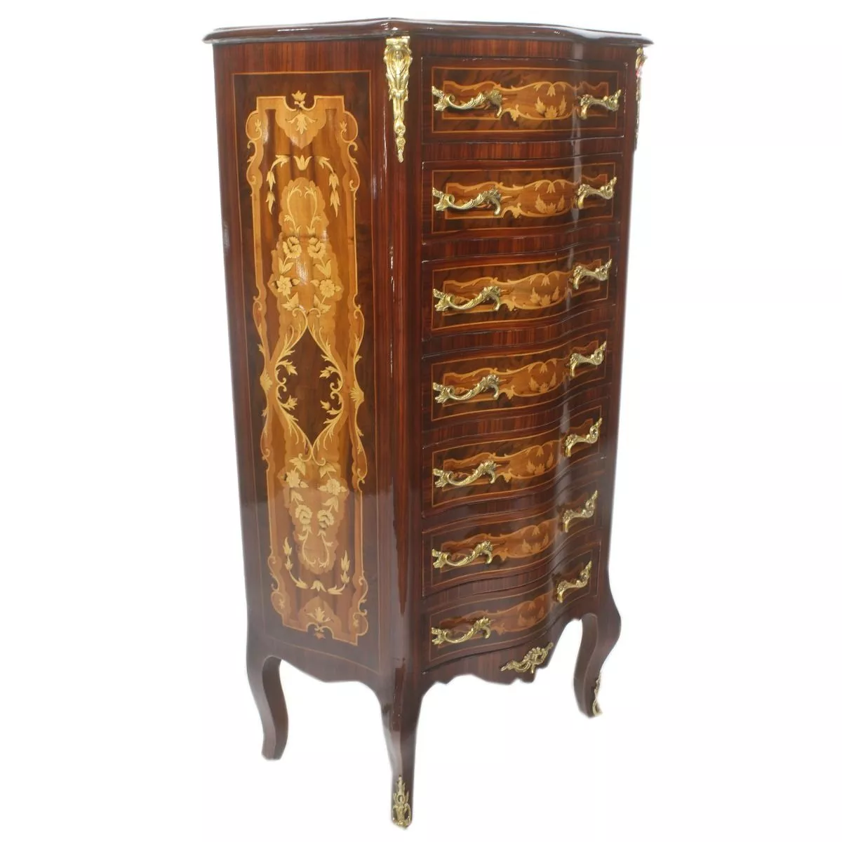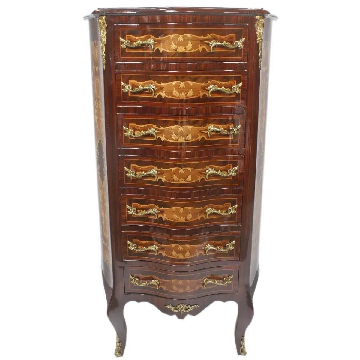 Exklusive und edele Kommode mit Wurzelholz im Barockstil mit 7 Schubladen . Handgefertigt aus massivem Pinienholz ist die Kommode robust und schwer. Da echtes Wurzelholz verarbeitet wird, kann die Farbe vom Foto leicht abweichen.