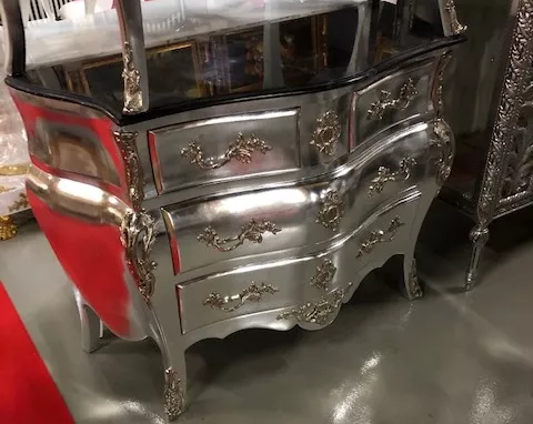 Hochwertige Kommode mit Blattsilber im edelen Barockstil.Die Kommode wurde in Handarbeit aus massivem Buchenholz gefertigt und ist damit schwer und auerordentlich stabil. Die Beschlge sind aus Bronze silber.Die Platte ist echten Marmor Farbe schwarz