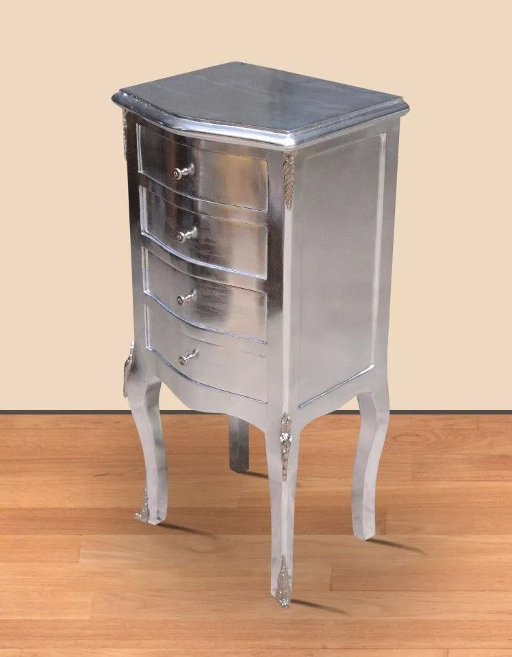 Exklusive und edele Kommode mit Blattsilber im Barockstil mit 4 Schubladen . Handgefertigt aus massivem Pinienholz ist die Kommode robust und schwer. Da echtes Blattsilber verarbeitet wird, kann die Farbe vom Foto leicht abweichen.