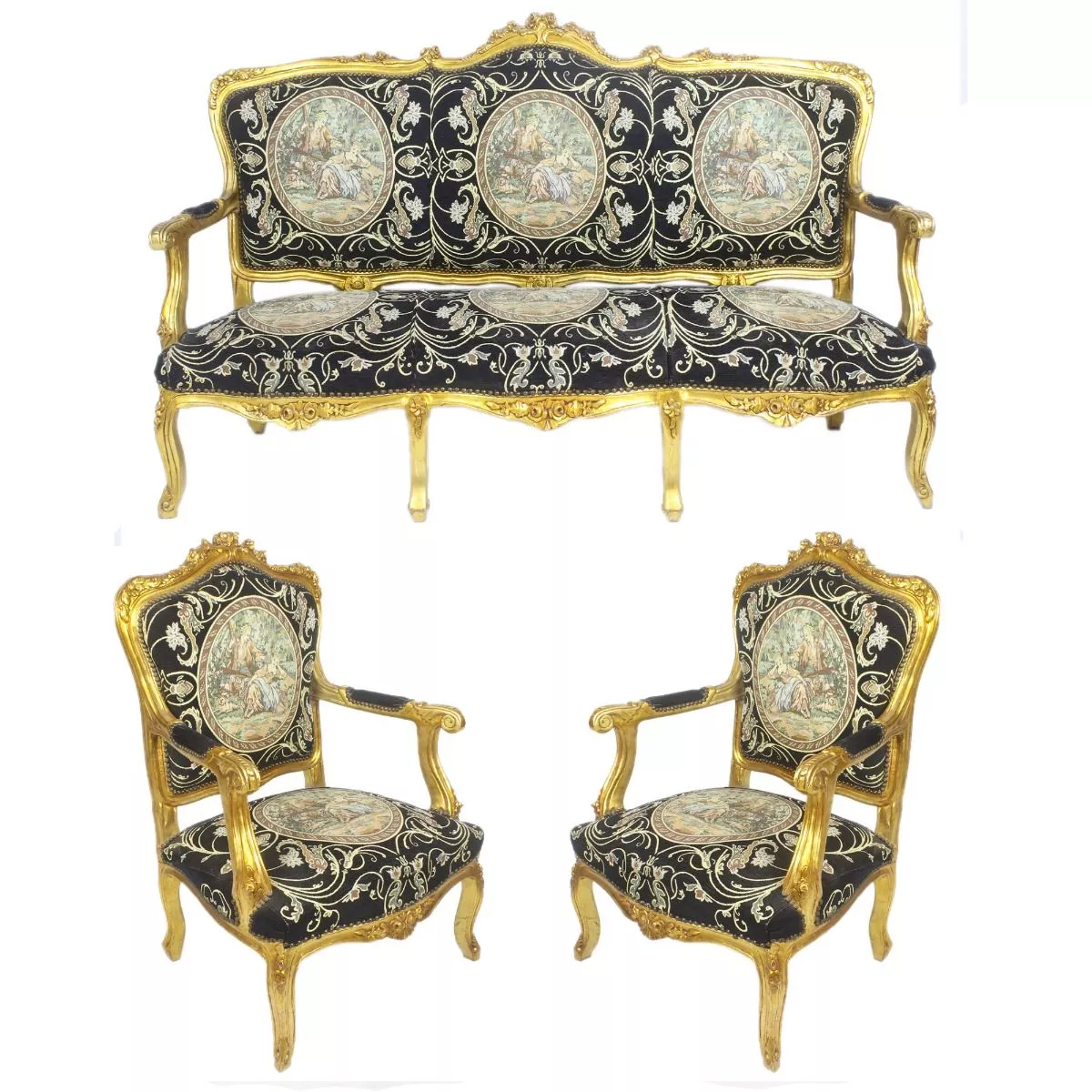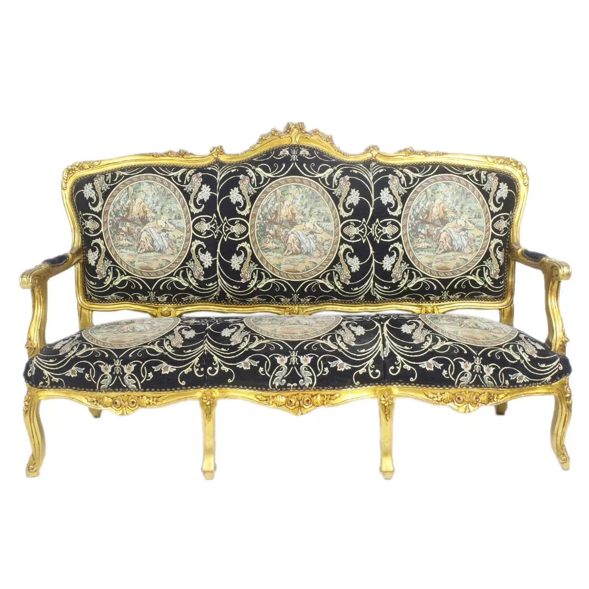 Dieses edle Barocksofa mit goldenem Rahmen und einem hochwertigen, gemustertem Stoffpolster setzt einen romantisch-klassischen Akzent in jeden Raum. Es handelt sich um echte Handarbeit aus massiven, robusten Buchenholz im typischen Barockstil.