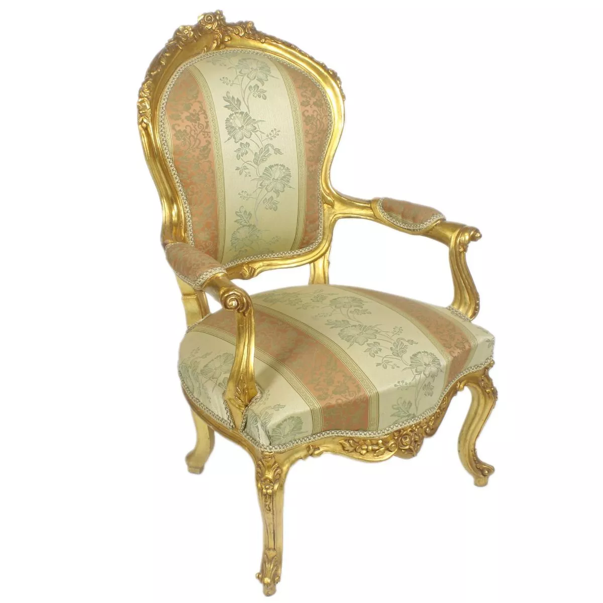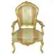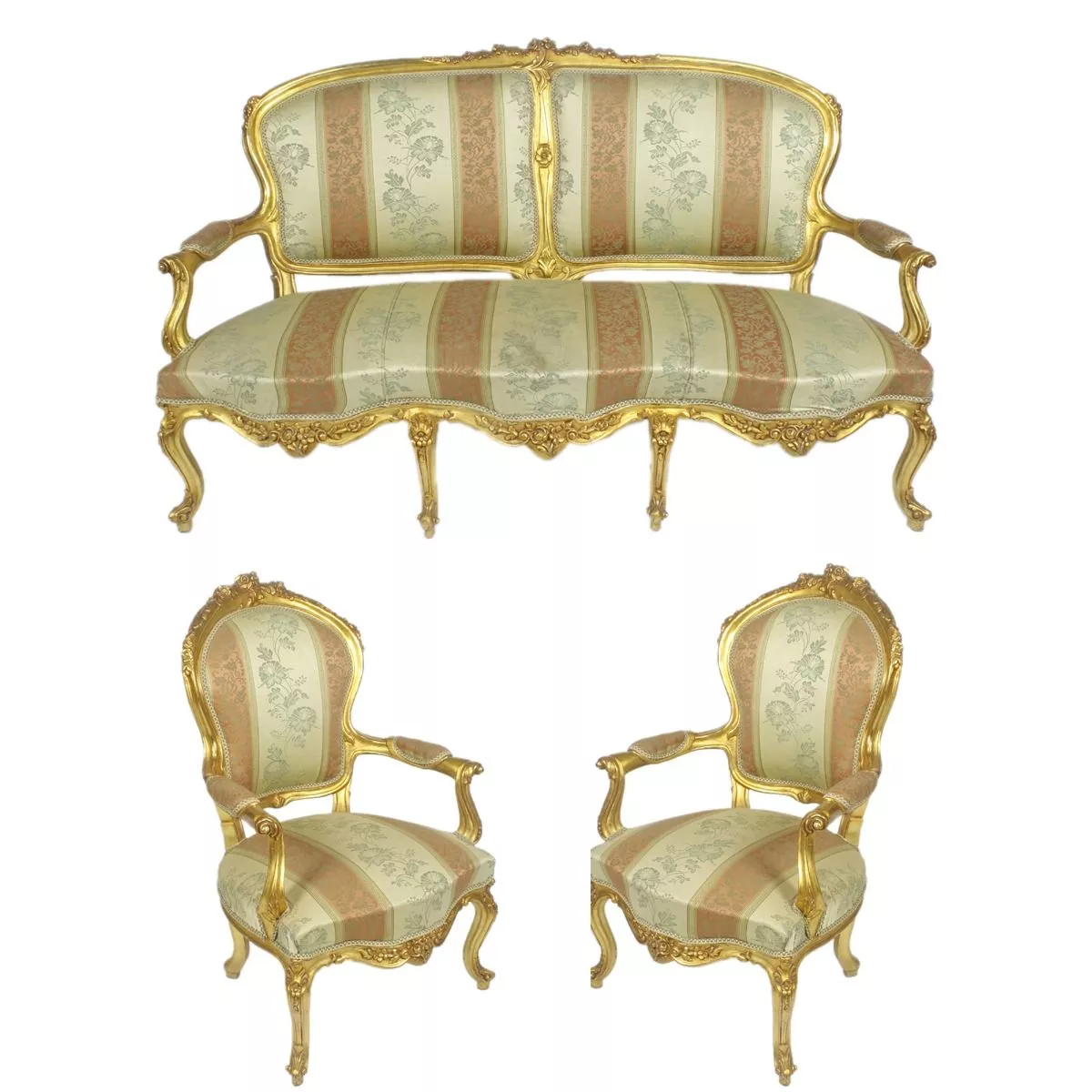 Dieses edle Barocksofa mit goldenem Rahmen und einem hochwertigen, gemustertem Stoffpolster setzt einen romantisch-klassischen Akzent in jeden Raum. Es handelt sich um echte Handarbeit aus massiven, robusten Buchenholz im typischen Barockstil.