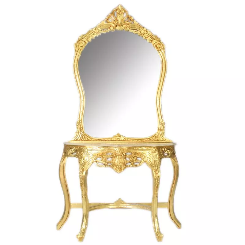 Edler Schminktisch mit groem Spiegel, goldenemRahmen und qualitativer Mamorplatte im luxurisen Barockstil. Echte Handarbeit aus massivem Buchenholz. Die hochwertige Barockkonsole eignet sich perfekt als Schminktisch oder als Spiegelkonsole im Flur.