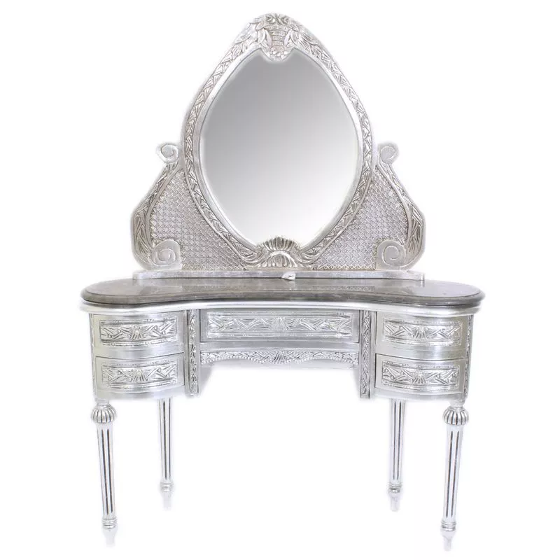 Luxurise Spiegelkonsole mit silbernemRahmen im stilvollen Barockstil. Echte Handarbeit aus massivem Buchenholz. Die hochwertige Barockkonsole eignet sich perfekt als Schminktisch mit ihrem groen Spiegel.