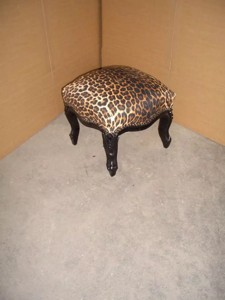 Klassischer Barockhocker mit schwarzen Rahmen aus massiven, robusten Buchenholz im typischen Barockstil. Hochwertiges und bequemes Polster mitLeo-Muster.