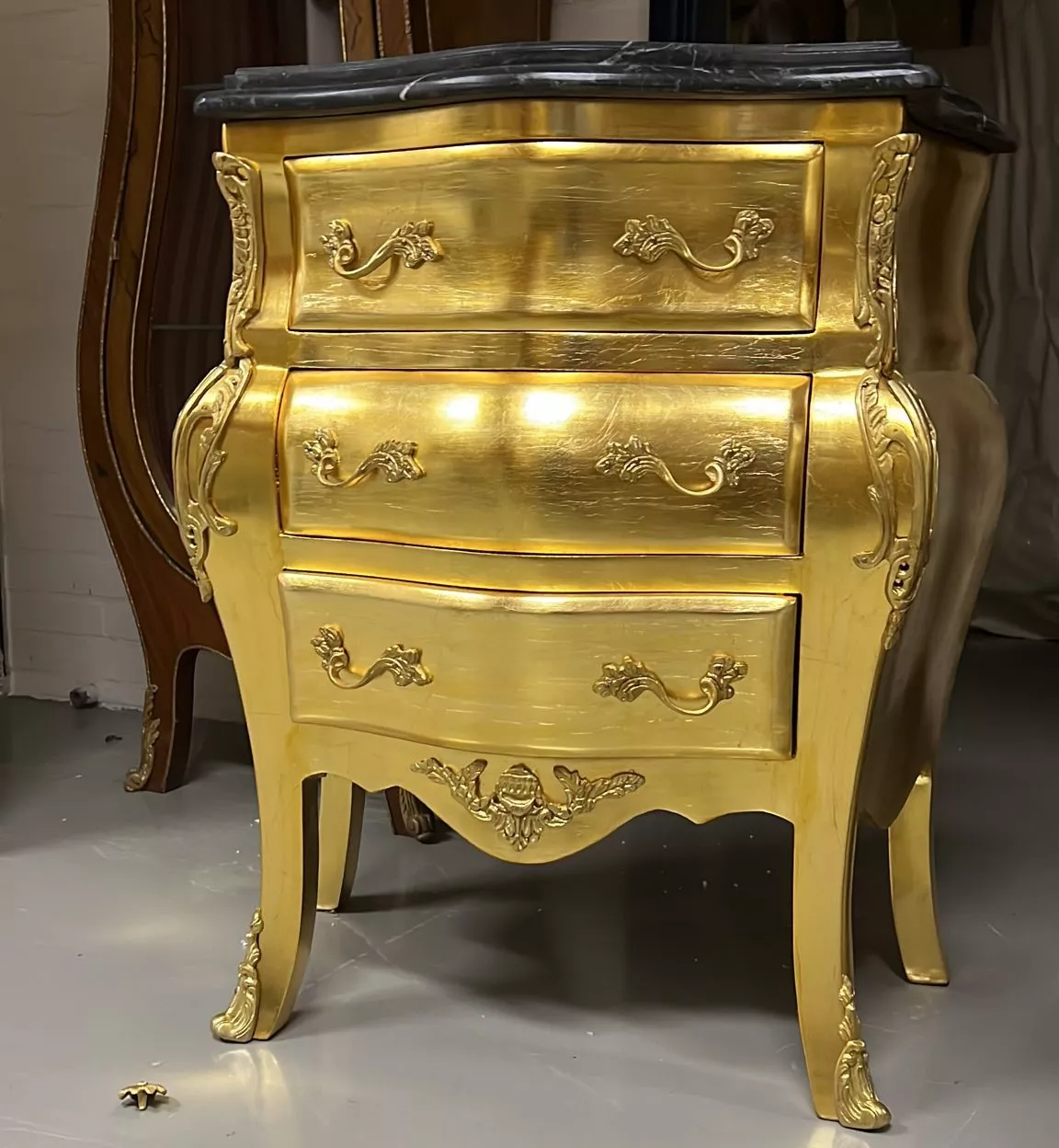 Exklusive und edele Kommode im Barockstil mit Marmorplatte. Handgefertigt aus massivem Pinienholz ist die Kommode robust und schwer. Da echtes Blattgoldr verarbeitet wird, kann die Farbe vom Foto abweichen.