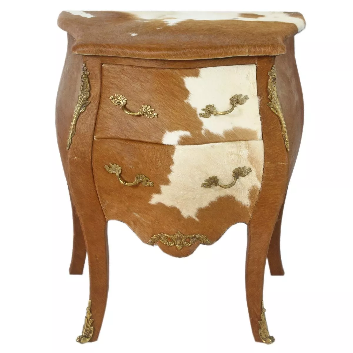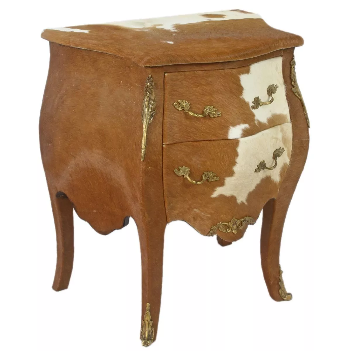 Exklusive und edele Kommode im Barockstil mit echtem Kuhfell berzogen. Handgefertigt aus massivem Pinienholz ist die Kommode robust und schwer. Da echtes Fell verarbeitet wird, kann das Fellmuster vom Foto abweichen.