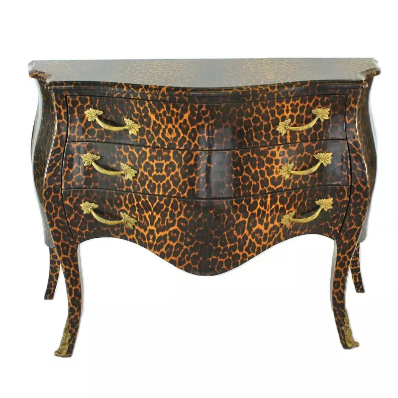 Exklusive und edele Kommode im Barockstil mit leostoff berzogen. Handgefertigt aus massivem Pinienholz ist die Kommode robust und schwer. Da echtes Stoff verarbeitet wird, kann dasStofflmuster vom Foto abweichen. Die Kommode ist Hochglanz lackiert.