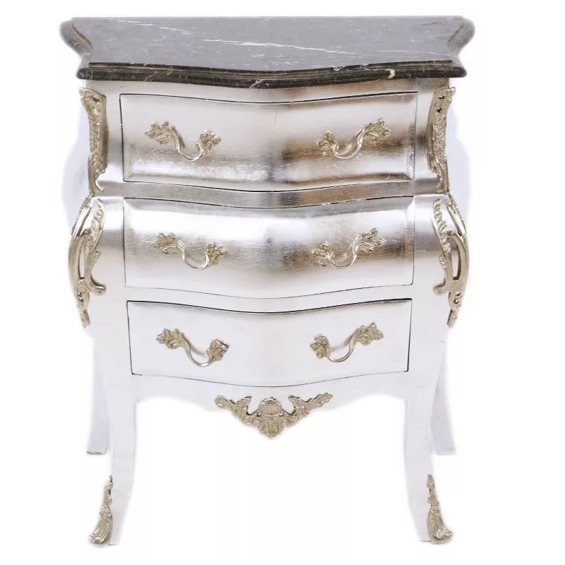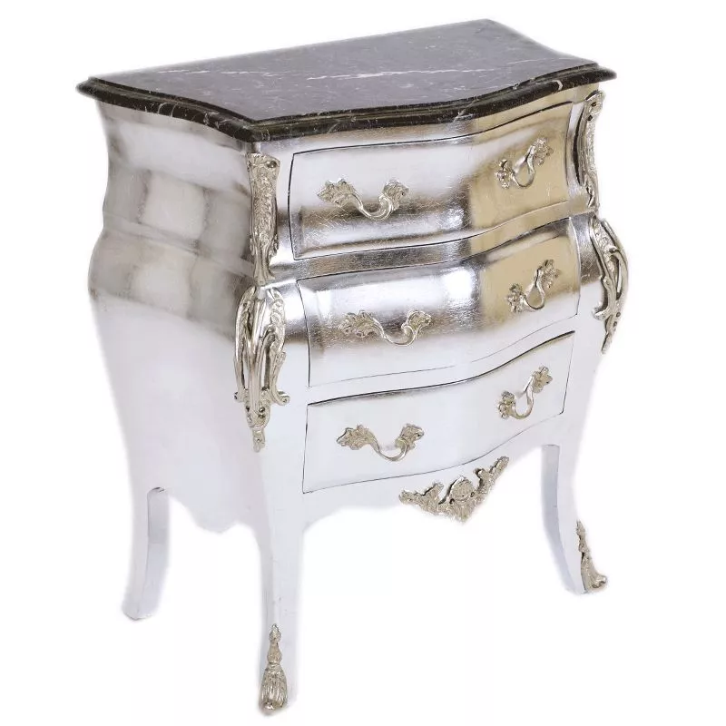 Exklusive und edele Kommode im Barockstil mit Marmorplatte. Handgefertigt aus massivem Pinienholz ist die Kommode robust und schwer. Da echtes Blattsilber verarbeitet wird, kann die Farbe vom Foto abweichen.