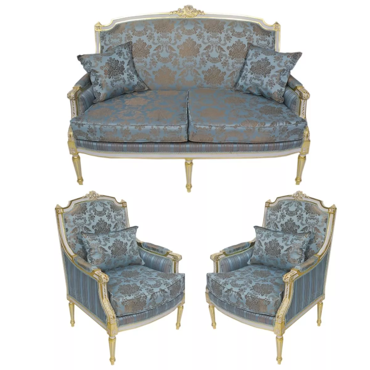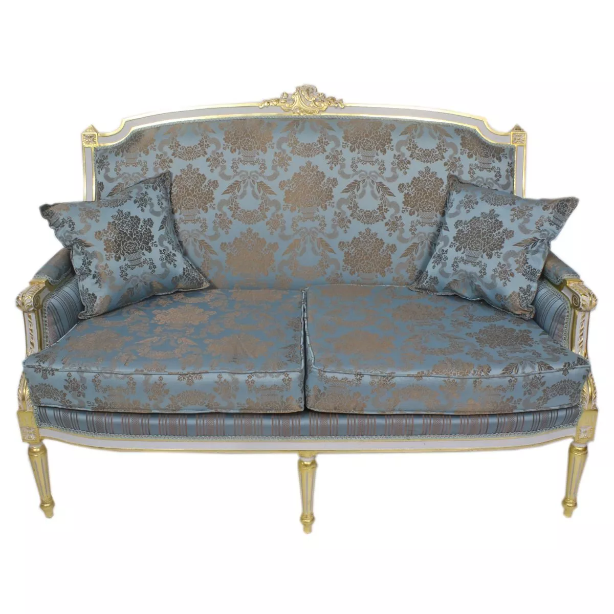 Dieses edle Barocksofa mit goldenem Rahmen und einem hochwertigen, gemustertem Stoffpolster setzt einen romantisch-klassischen Akzent in jeden Raum. Es handelt sich um echte Handarbeit aus massiven, robusten Buchenholz im typischen Barockstil.