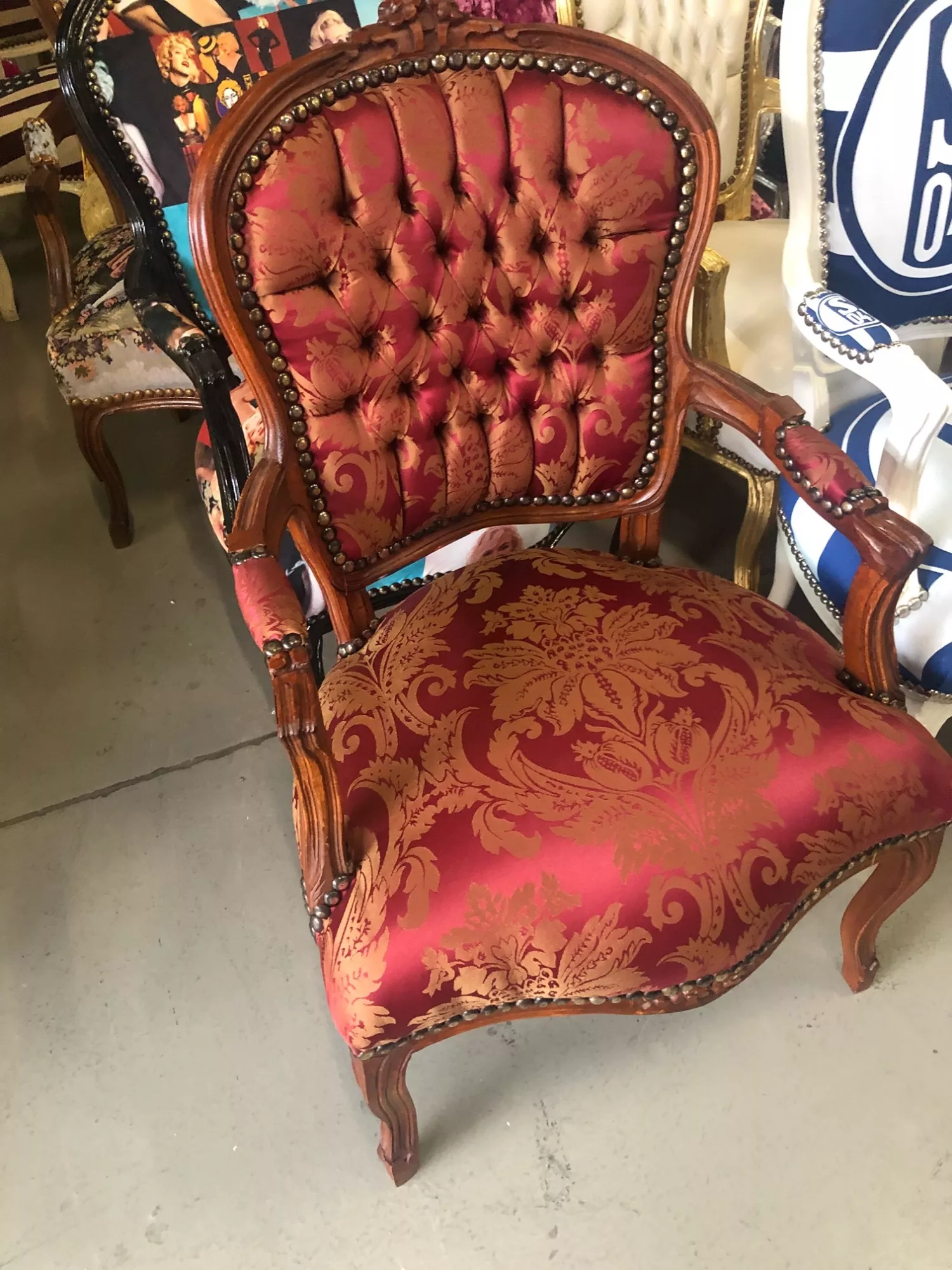 Dieser edle Barockstuhl mit braunen Rahmen und qualitativem, bordeaux-farbenem Samtstoff wurde in echter Handarbeit aus massivem Buchenholz gefertigt und ist damit sehr stabil und schwer. Ob passend zum bequemen Barocksofa, als Stuhl im Esszimmer oder alleinstehend, verleiht er jedem Ambiente einen klassisch-luxurisen Stil. Das Modell ist auch in anderen Farben erhältlich.