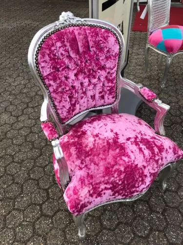 Dieser schicke Barocksstuhl mit silbernem Rahmen und hochwertigem Polster aus pinkem Samtstoff wurde in echter Handarbeit aus massivem Buchenholz gefertigt und ist damit sehr stabil und schwer. Ob passend zum Barocksofa, als Stuhl im Esszimmer oder alleinstehend, verleiht er jedem Ambiente einen auergewhnlichen Stil. Der Sessel ist auch in anderen Farben erhältlich.