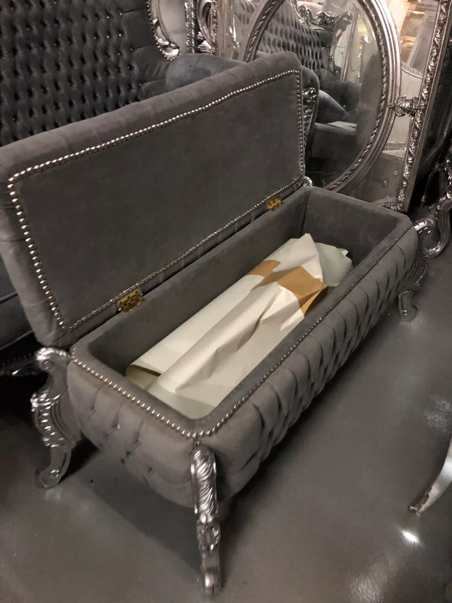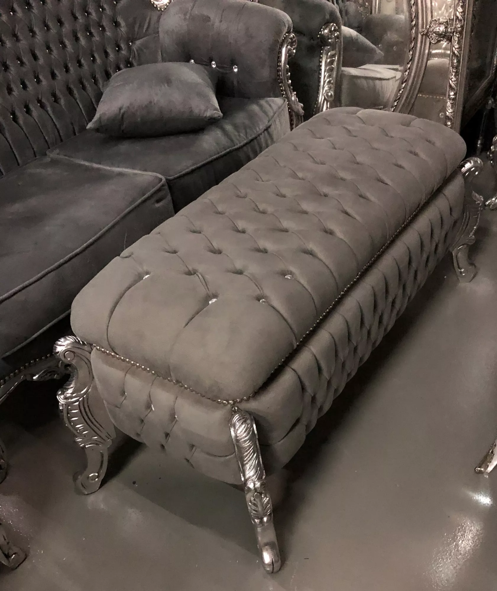 Luxurises BarockThrue mit silbernem Rahmen und einem hochwertigen, bequemen Polster in Grau. Handarbeit aus massiven, robusten Buchenholz im typischen Barockstil. Mae: Hhe ca. 50 cm, Breite ca. 120 cm, Tiefe ca. 50 cm