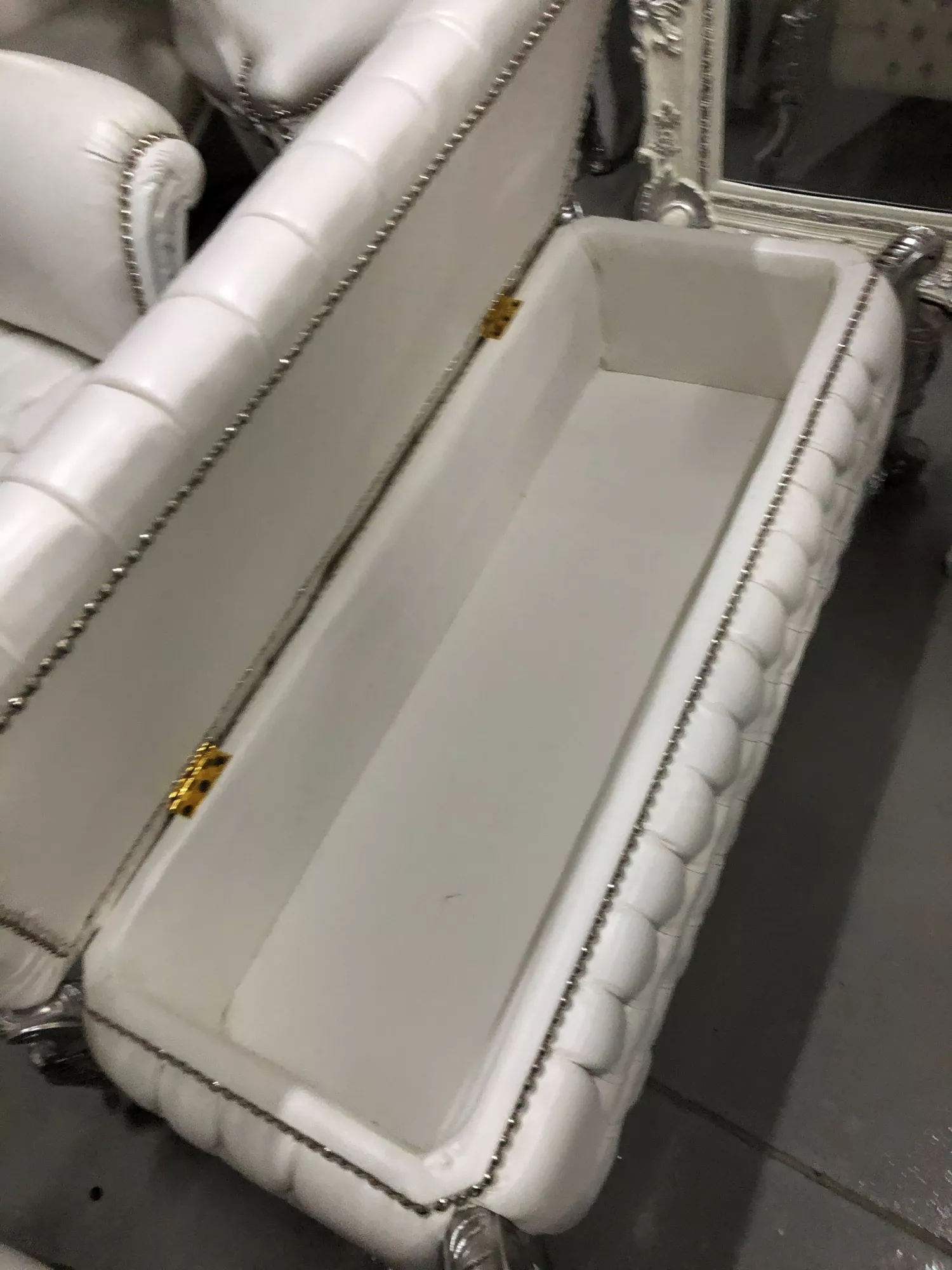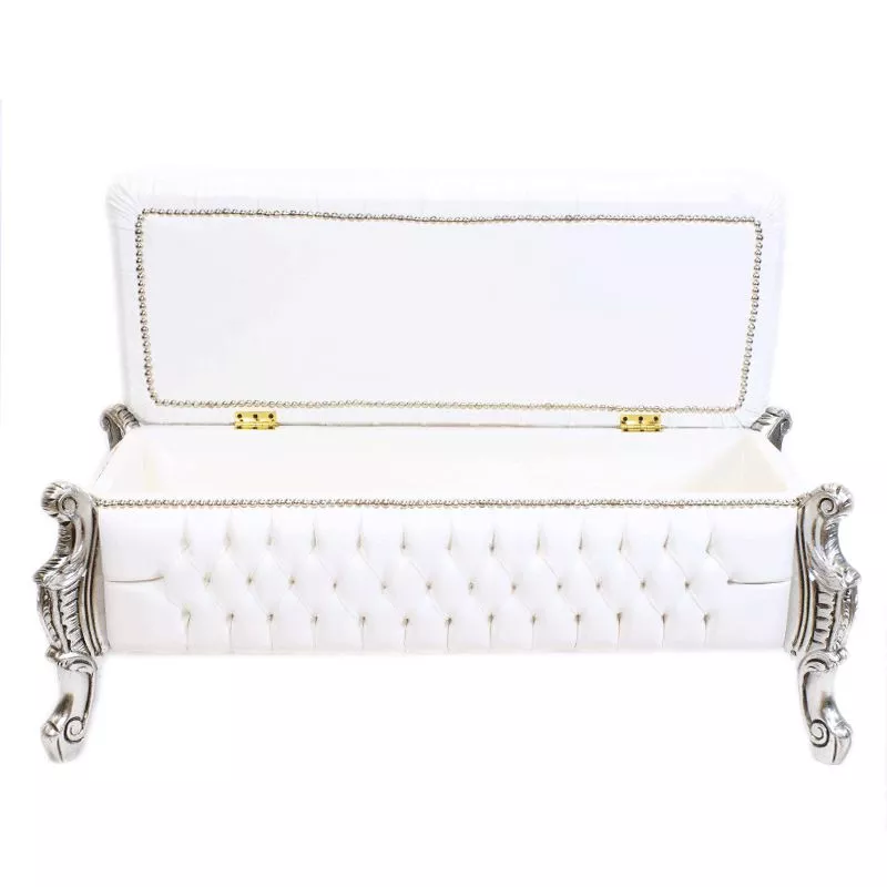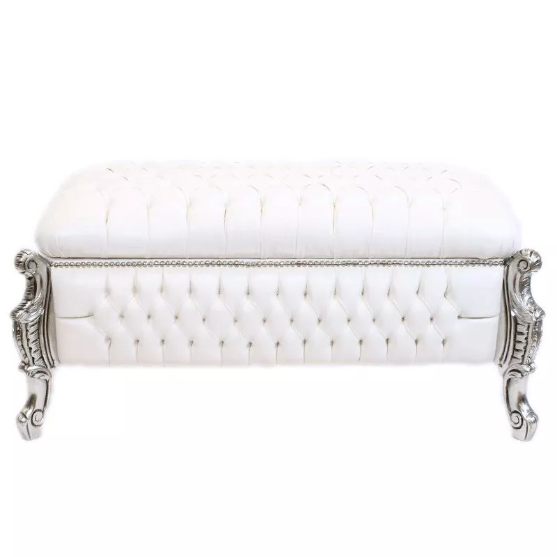 Luxurises Barockthrue mit silbernem Rahmen und einem hochwertigen, bequemen Polster in Kunstleder weiss. Handarbeit aus massiven, robusten Buchenholz im typischen Barockstil. Mae: Hhe ca. 50 cm, Breite ca. 120 cm, Tiefe ca. 50 cm