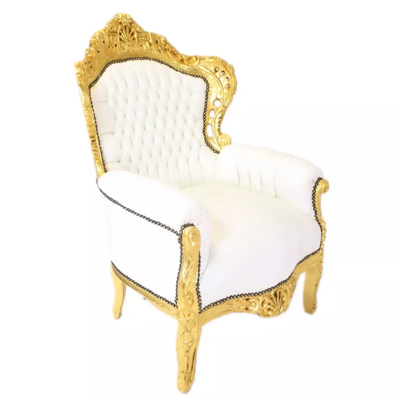 Edeler Barocksessel mit goldenem Rahmen aus massiven, robusten Buchenholz im typischen Barockstil. Hochwertiges und bequemes Polster weiss Kunstleder. In Handarbeit hergestellt.