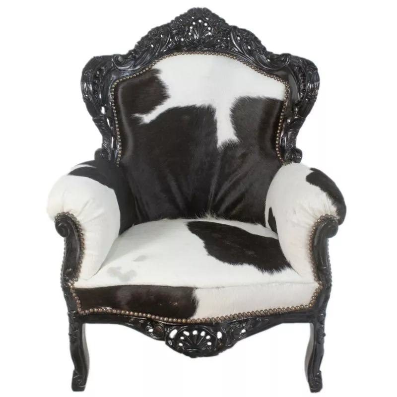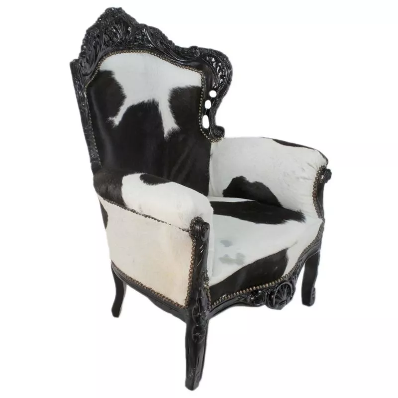 Edeler Barocksessel mit schwarzem Rahmen aus massiven, robusten Buchenholz im typischen Barockstil. Hochwertiges und bequemes Polster aus schwarz-weissen echten Kuhfell. Muster kann von Foto abweichen . In Handarbeit hergestellt.