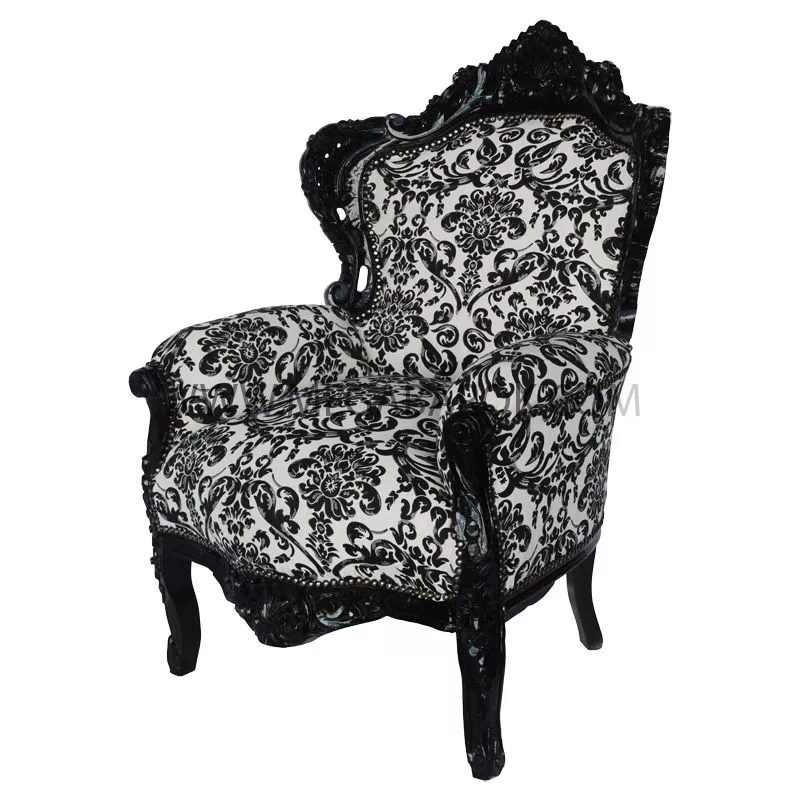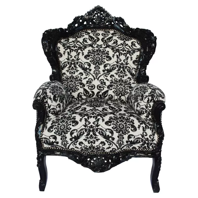 Edeler Barocksessel mit schwarzem Rahmen aus massiven, robusten Buchenholz im typischen Barockstil. Hochwertiges und bequemes Polster aus schwarz-wei gestreiftem Stoff. In Handarbeit hergestellt. Der Sessel ist auch in anderen Rahmenfarben und Bezugsfarben erhltlich.