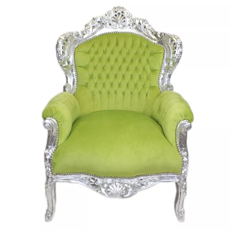 Edeler Barocksessel grn mit silbernem Rahmen aus massiven, robusten Buchenholz im typischen Barockstil. Hochwertiges und bequemes Polster mit grünen Stoff. In Handarbeit hergestellt.Die Rahmenfarbe ist auch in schwarz erhältlich.