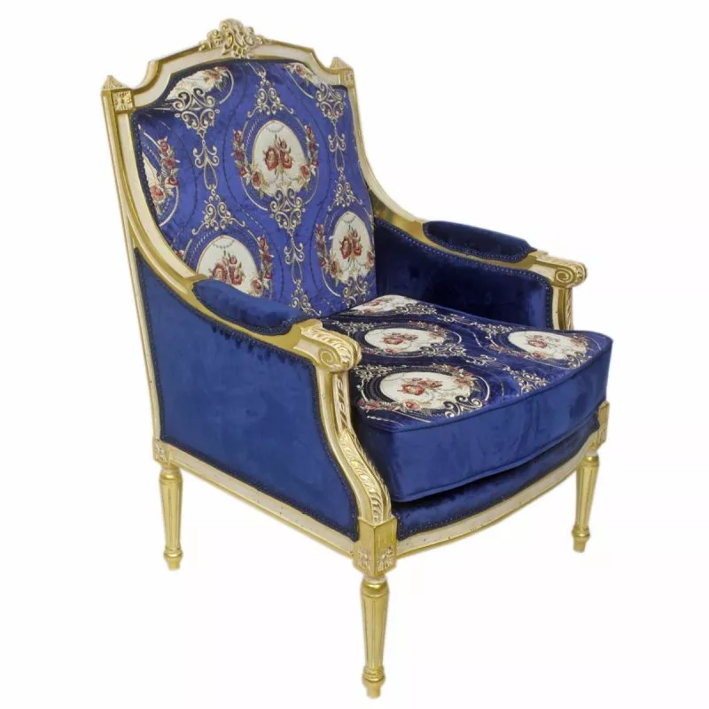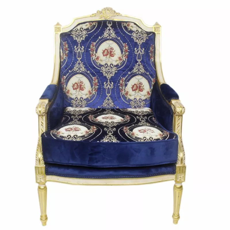 Empire Napels Edler Barocksessel mit massiven, robusten Buchenholzrahmen im typischen Barockstil. Hochwertiges und bequemes Polster aus Baumwollstoff Blau mit Muster In Handarbeit hergestellt. Der Sessel ist auch in anderen Rahmenfarben und Bezugsfarben erhltlich.