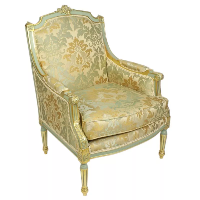 Empire Napels Edler Barocksessel mit massiven, robusten Buchenholzrahmen im typischen Barockstil. Hochwertiges und bequemes Polster aus Baumwollstoff gold mit Muster In Handarbeit hergestellt. Der Sessel ist auch in anderen Rahmenfarben und Bezugsfarben erhltlich.
