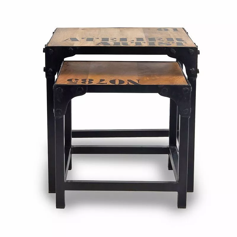 Die Platte ist braun mit schwarzem Text, und das Gesamtbild ist handgefertigt und einzigartig. Der große Tisch ist 45x45x45, der kleinere 40x40x40 groß. Sie können dieses vielseitige Stück als Beistelltisch, Couchtisch oder sogar als Nachttisch verwenden. Es ist perfekt für jeden Raum in Ihrem Zuhause.
