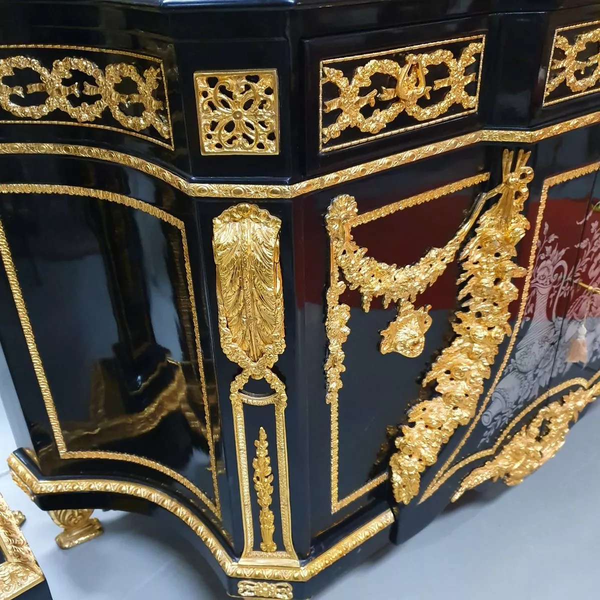 Luxus Barock Commode mit 2 Sulen schwarz-gold vergoldetim edelen Barockstil.Die Kommode wurde in Handarbeit aus massivem Buchenholz gefertigt und ist damit schwer und auerordentlich stabil. Die Beschlge sind aus Bronze vergoldet.Die Platte ist Hochglanz Farbe schwarz. Ohne Vasen.
