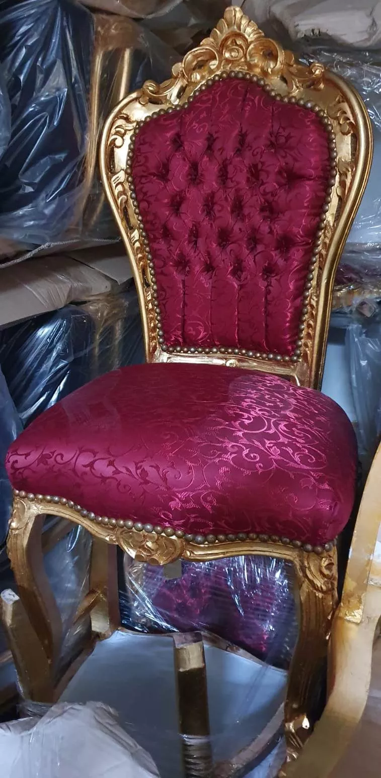 Barockstuhl St 5 Rahmen Blattgold Polster Stoff Farbe gold.Barockstil, Massiv und schwer,der Sessel ist wirklich ein Schmuckstck.Mae: Hhe ca. 106 cm Breite ca. 56 cm Tiefe ca.55 cm Sitzhhe ca. 52-54 cmMaterial: Bezug aus Stoff, Buche MassivholzBitte beachten Sie dass das ein repliziertes Mbel ist und auf antik veredelt wurde,
